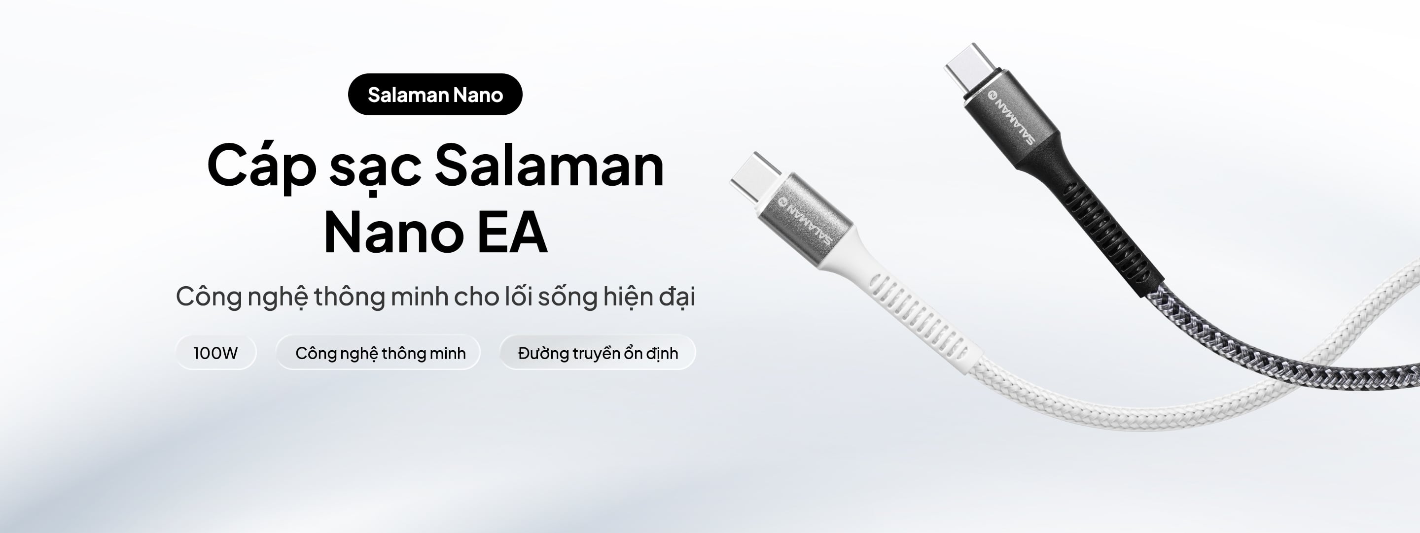 Cáp Salaman Nano EA là chuẩn mực chất lượng mới: Sạc siêu tốc 100W với lõi đồng nguyên chất, cam kết bền bỉ hơn 30.000 lần gập, đảm bảo hiệu suất và an toàn tối đa cho mọi thiết bị USB-C.