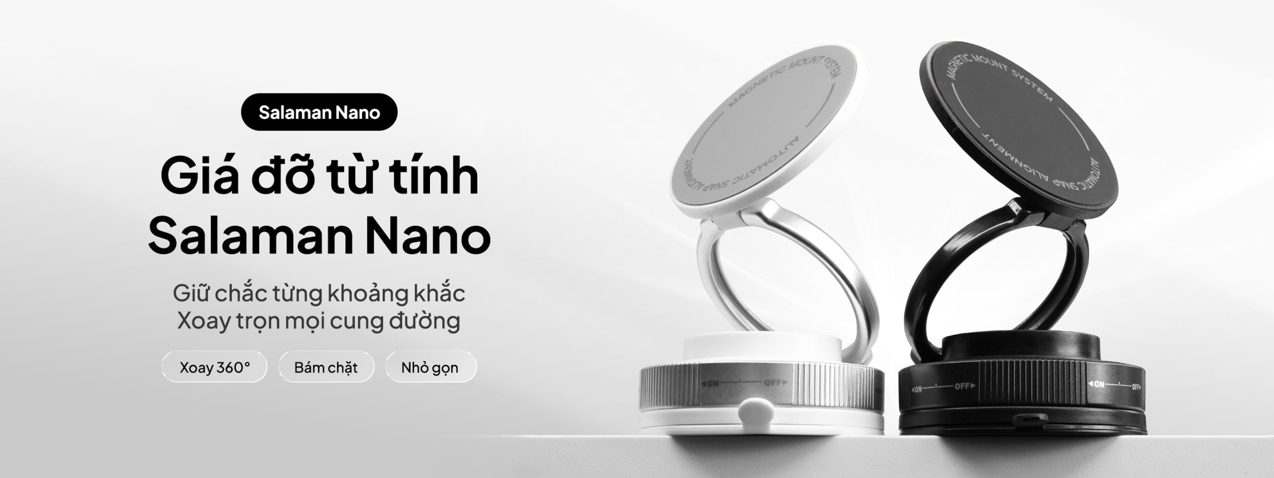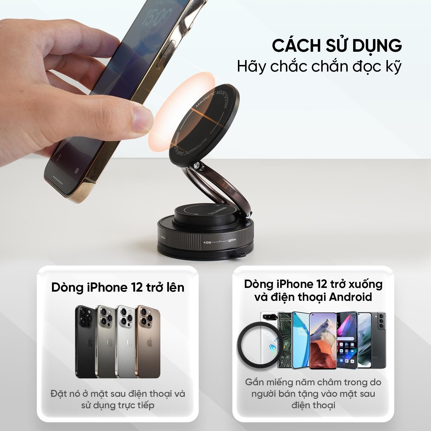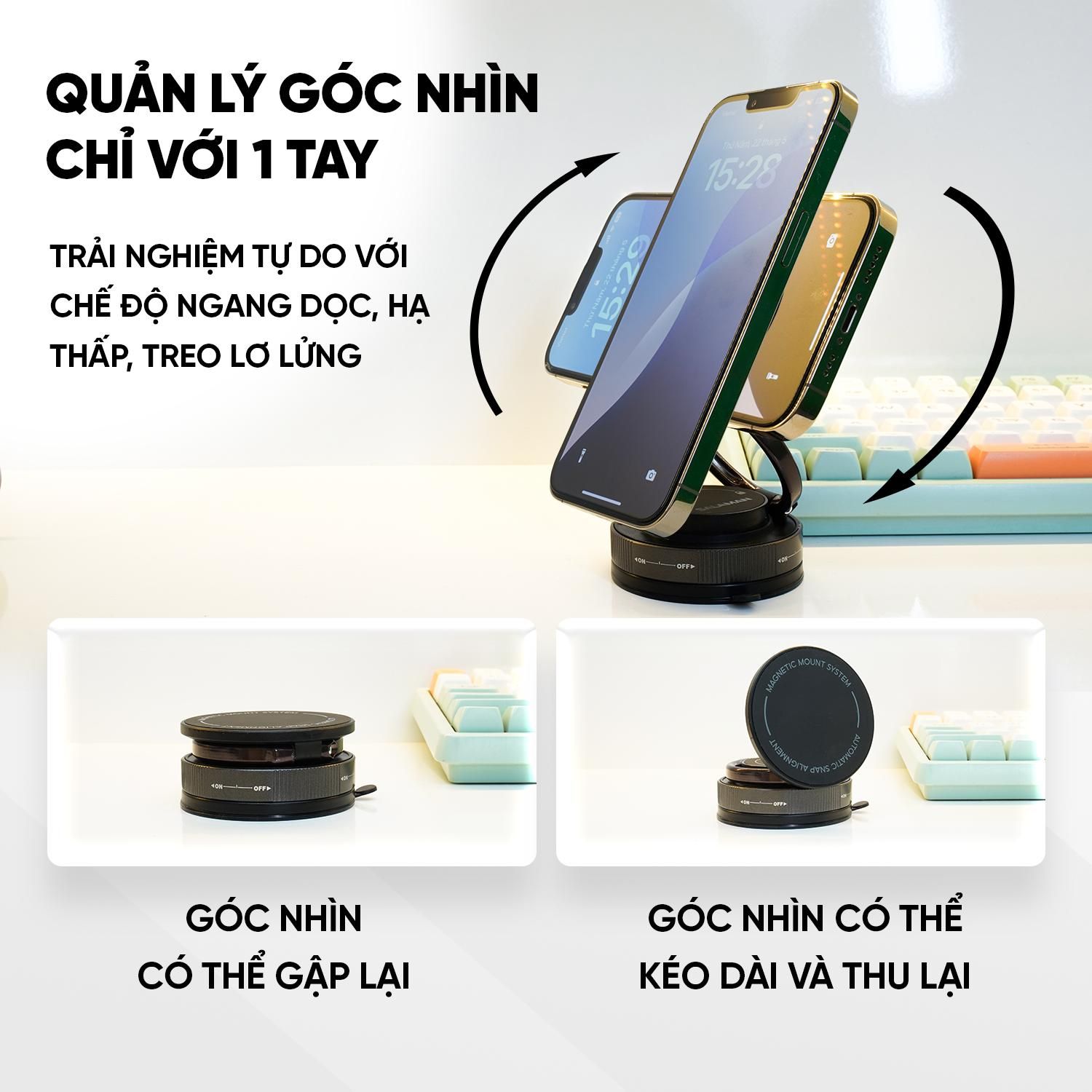 Ứng dụng công nghệ hút từ mạnh mẽ và chân đế chân không siêu bám, giúp giữ thiết bị ổn định dù gắn trên ô tô hay bàn làm việc. Góc xoay 360° linh hoạt, thiết kế gọn nhẹ – tiện lợi mọi nơi, an toàn mọi lúc.