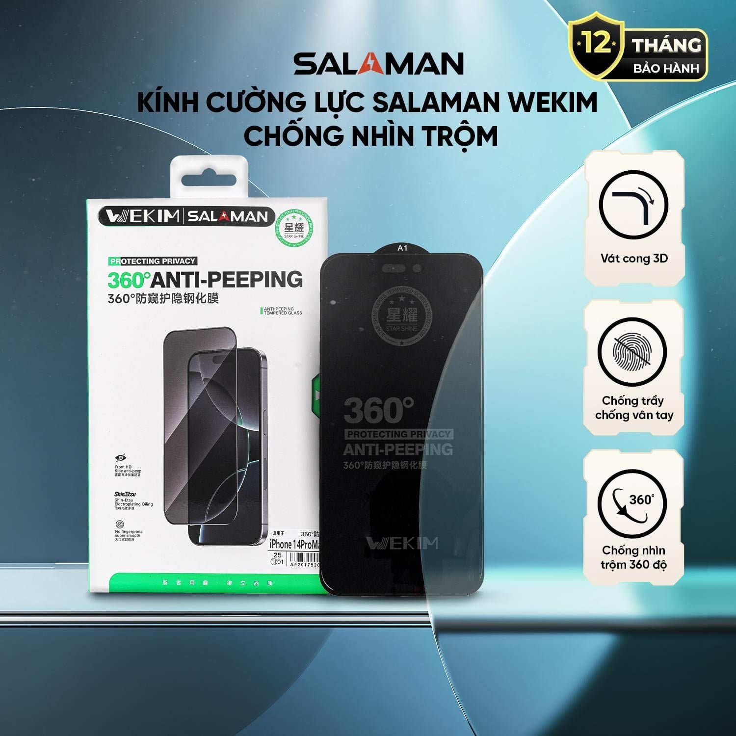 Salaman Wekim là dòng kính cường lực chống nhìn trộm cao cấp, kết hợp giữa công nghệ bảo mật 360° và thiết kế tràn viền 3D đẳng cấp. Sản phẩm sử dụng vật liệu kính có độ bền cao, bề mặt được xử lý nano chống bám bẩn và chống trầy xước hiệu quả. Với khả năng hiển thị sắc nét khi nhìn trực diện và đường vát cong mượt mà, đây là phụ kiện không thể thiếu để bảo vệ thông tin cá nhân và màn hình smartphone một cách toàn diện.