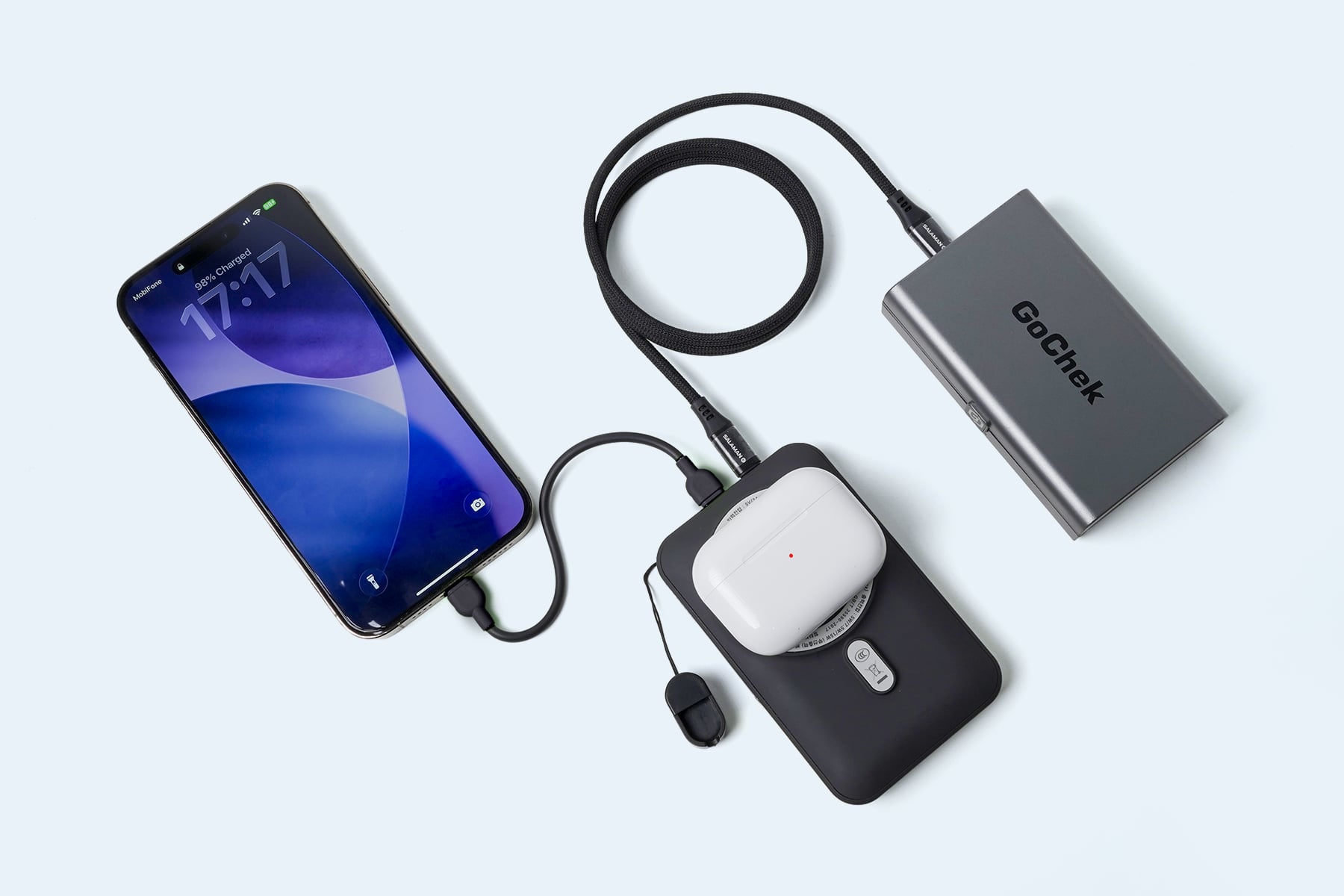 Thiết kế All-in-one đa năng: Tích hợp sẵn dây sạc nhanh 2-in-1 (Type-C & Lightning) cùng chân kê gập gọn tiện lợi, đáp ứng mọi nhu cầu sạc và giải trí.