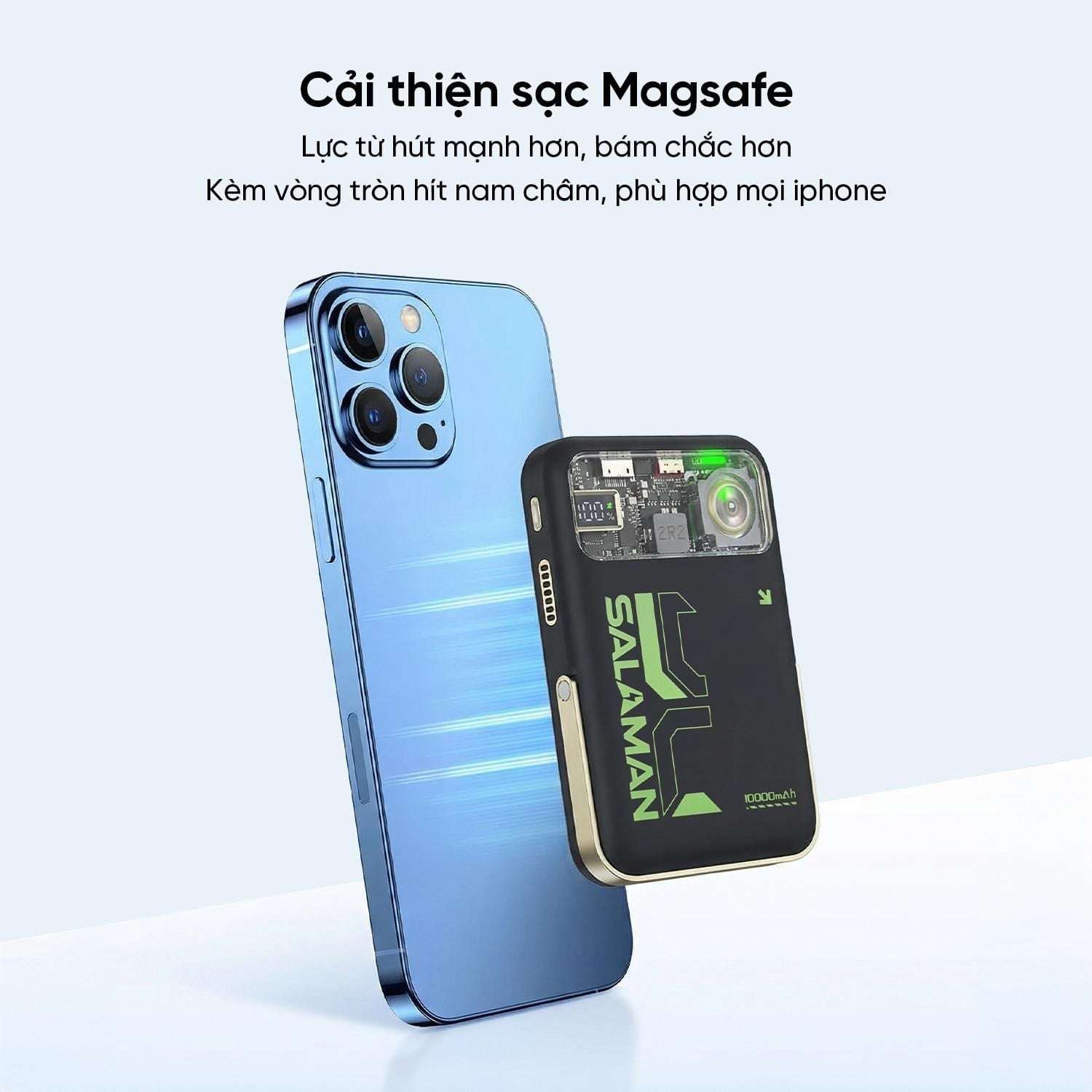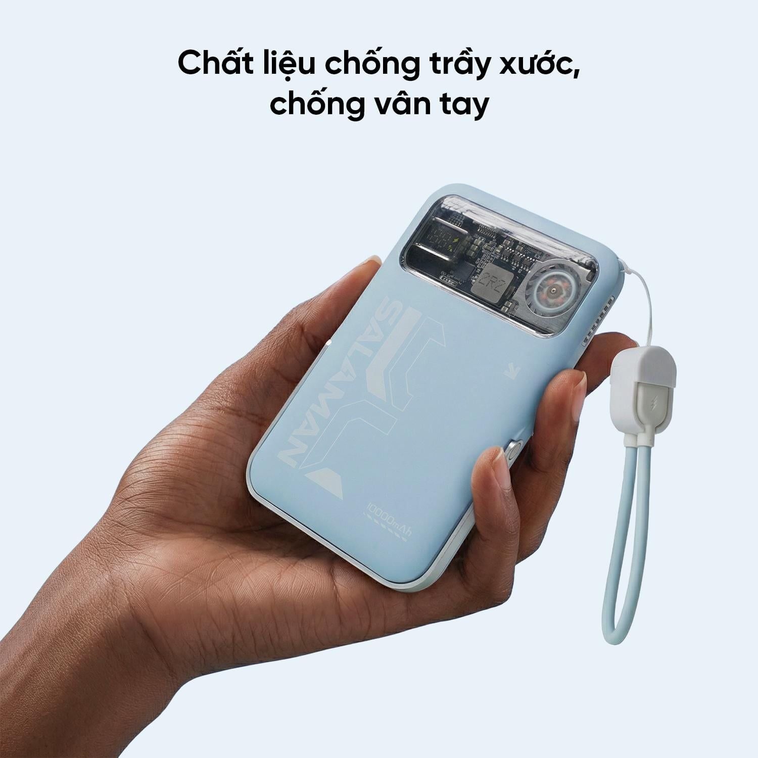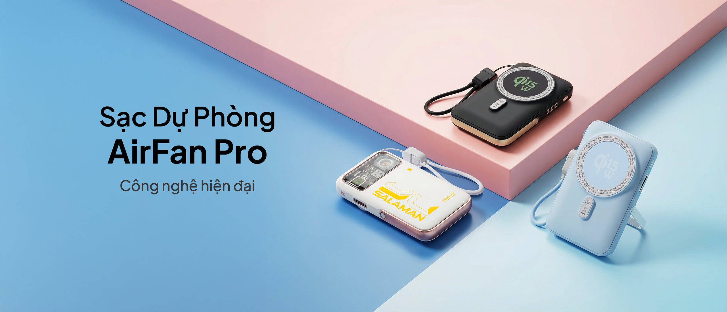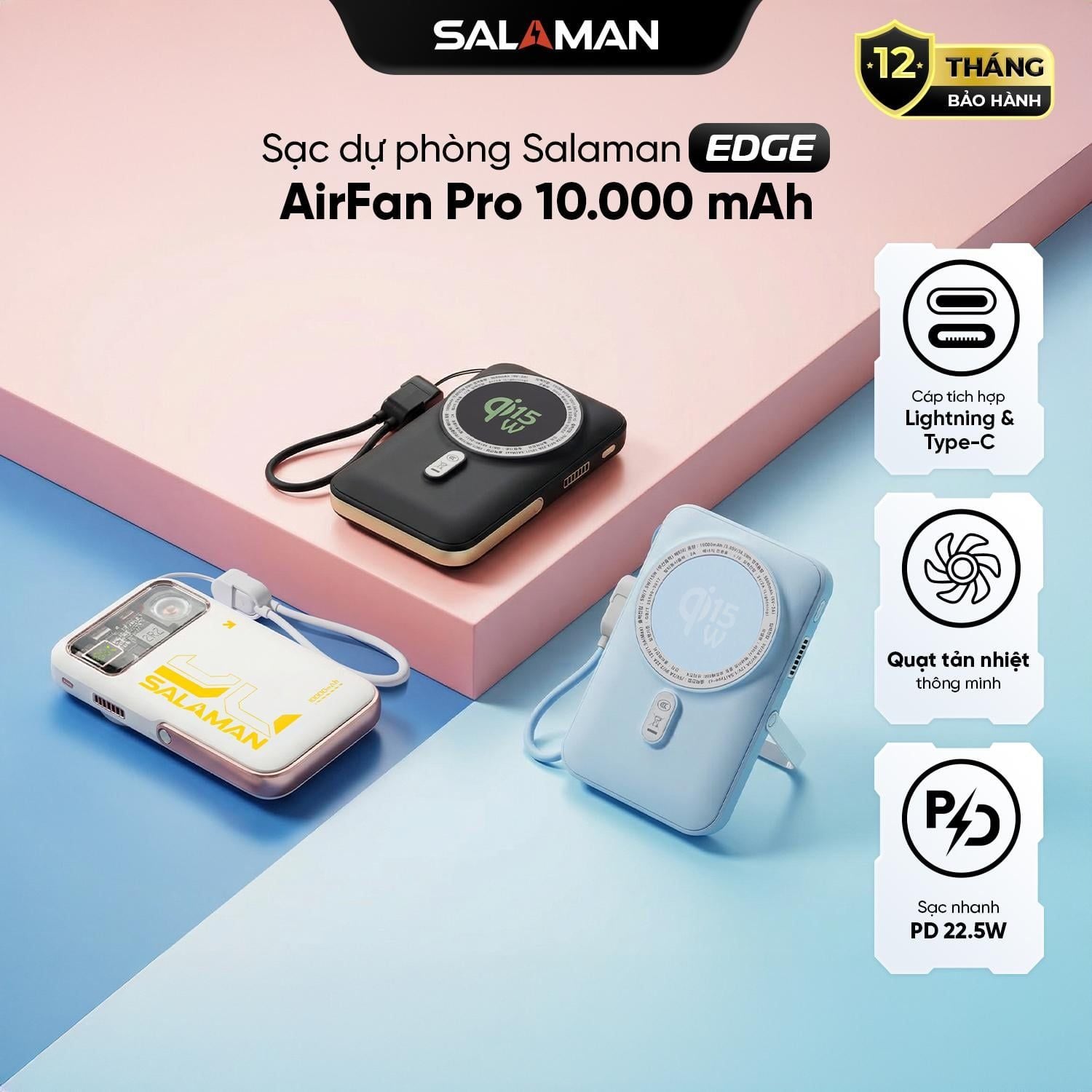 Salaman AirFan PRO là bản nâng cấp toàn diện với dung lượng 10000mAh, sở hữu lõi pin chuẩn MSDS an toàn tuyệt đối. Sản phẩm gây ấn tượng mạnh với khả năng sạc không dây tối đa 15W và hệ thống tản nhiệt tĩnh lặng có thể bật/tắt chủ động. Thiết kế lộ cơ hiện đại, bề mặt chống trầy xước cùng trọng lượng nhẹ chỉ 210g biến đây thành phụ kiện công nghệ không thể thiếu cho các Tech-fans.