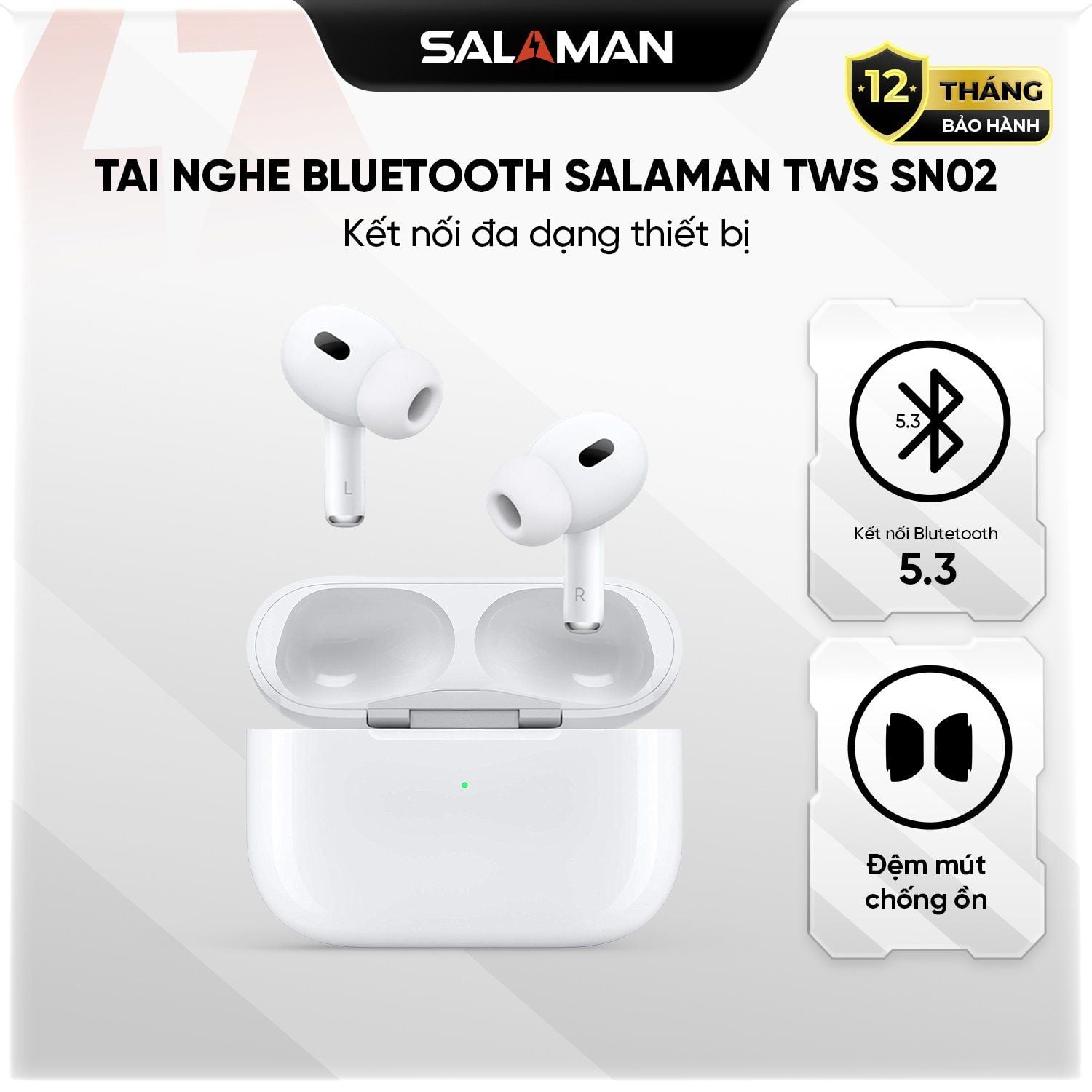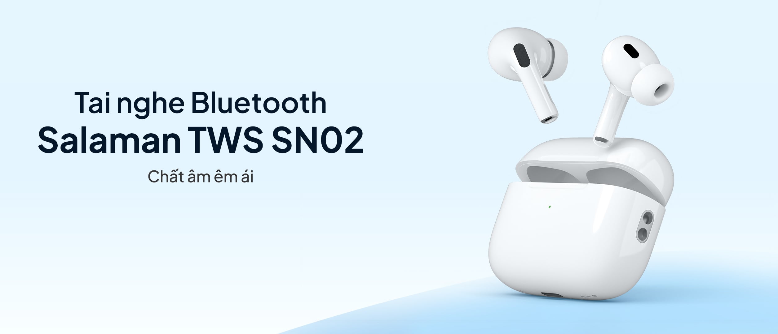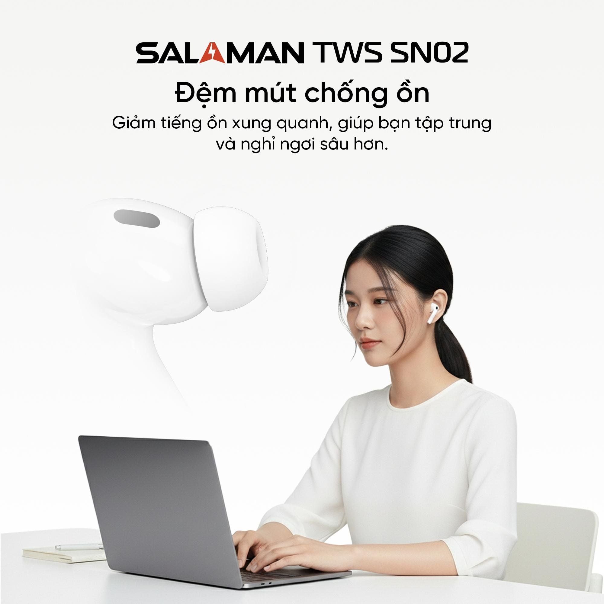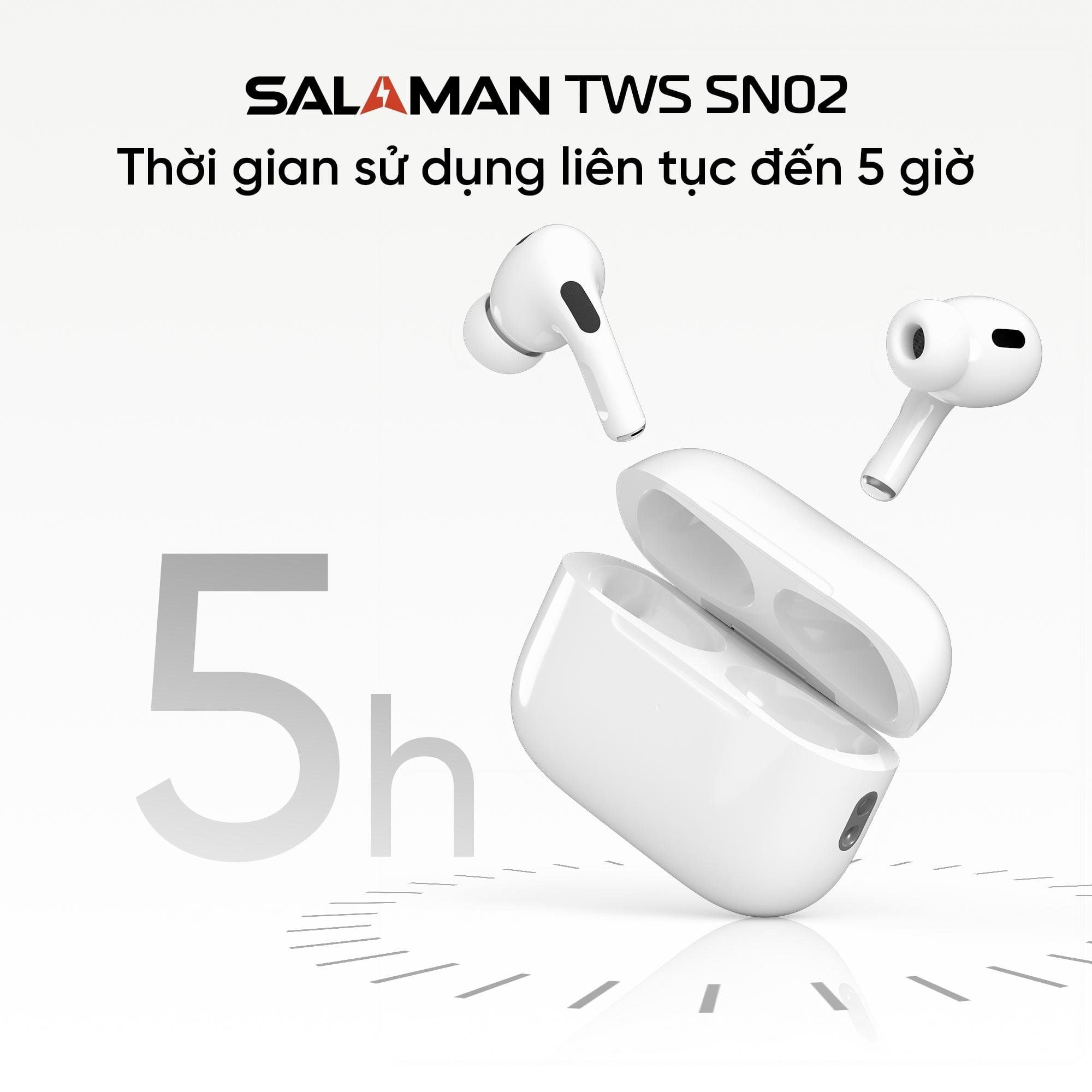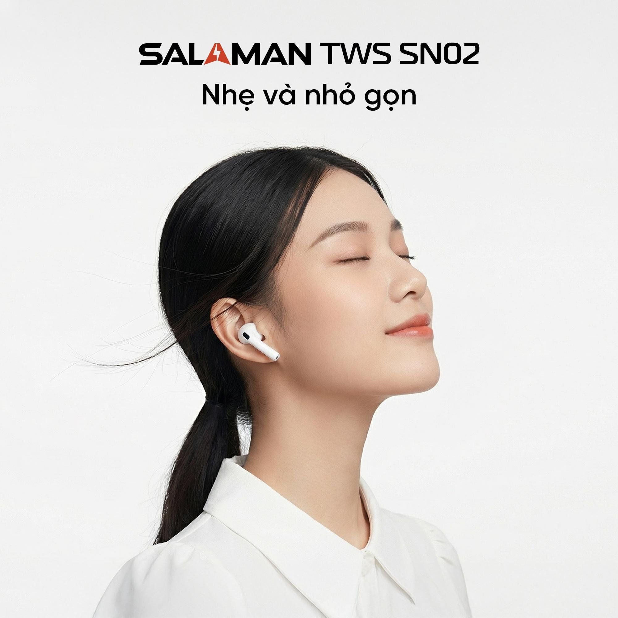 Tai nghe Bluetooth Salaman Nano TWS-SN02 là mẫu tai nghe không dây mang thiết kế nhỏ gọn, hiện đại, phù hợp cho nhu cầu học tập, làm việc và giải trí. Sử dụng chip JL83D4 kết hợp Bluetooth 5.3, sản phẩm mang đến khả năng kết nối nhanh, ổn định, hạn chế trễ và giữ tín hiệu tốt trong phạm vi 12m.