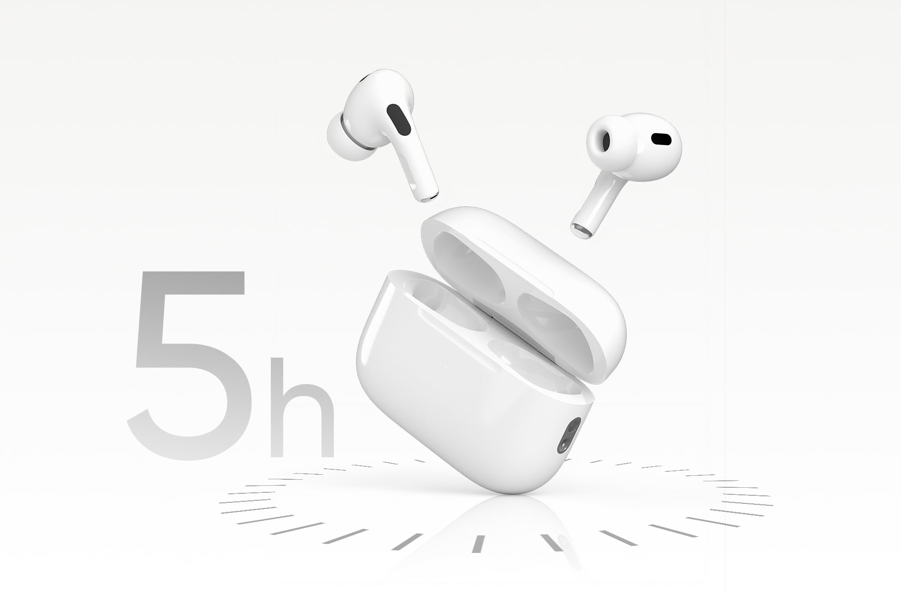 Nghe nhạc liên tục 5 giờ, đi kèm hộp sạc 200mAh hỗ trợ sạc không dây, cùng thiết kế nhẹ gọn, tinh tế dễ dàng mang theo.