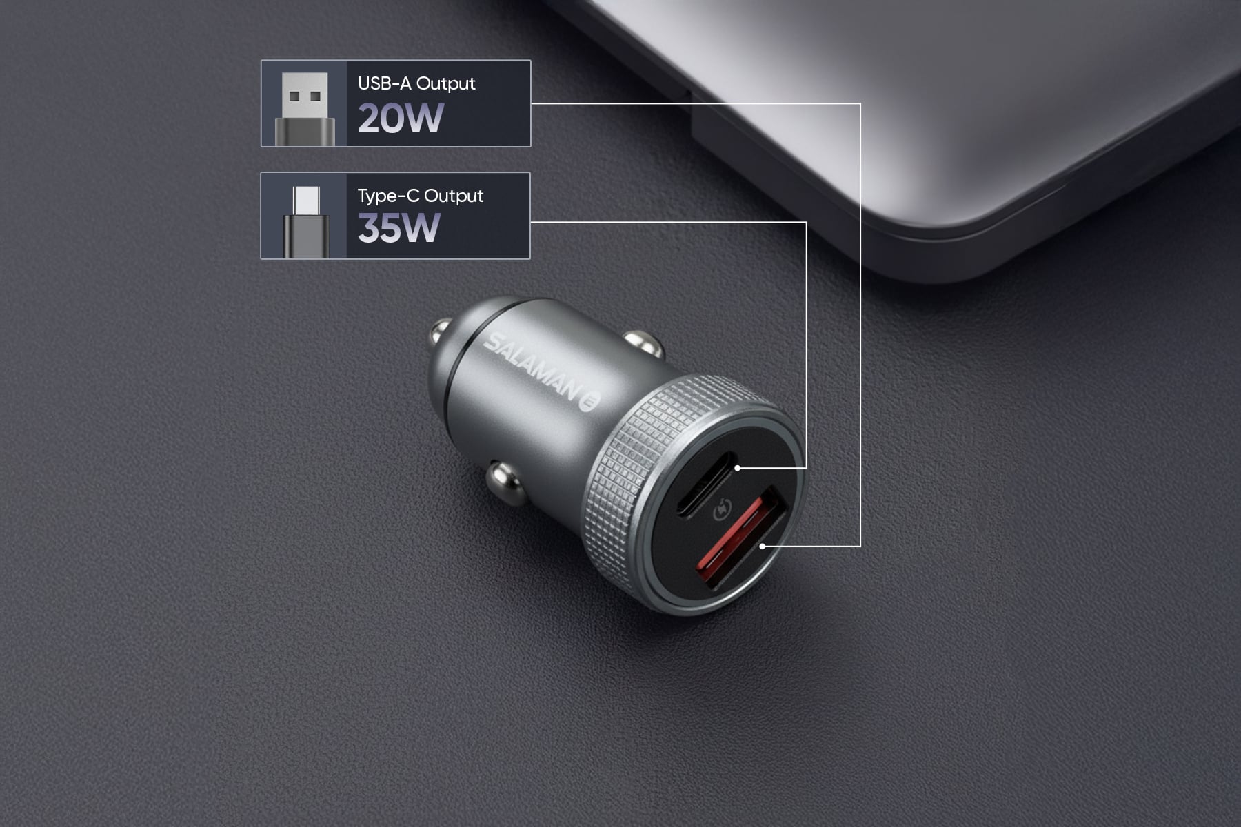 Tẩu Sạc Ô Tô Salaman Edge SF 55W là giải pháp sạc nhanh hoàn hảo cho xe hơi của bạn. Với tổng công suất 55W, tẩu sạc hỗ trợ sạc cùng lúc 2 thiết bị qua cổng USB và Type-C, giúp tiết kiệm tối đa thời gian. Sản phẩm có thiết kế nhỏ gọn, tiện lợi và đạt các chứng nhận an toàn quốc tế.